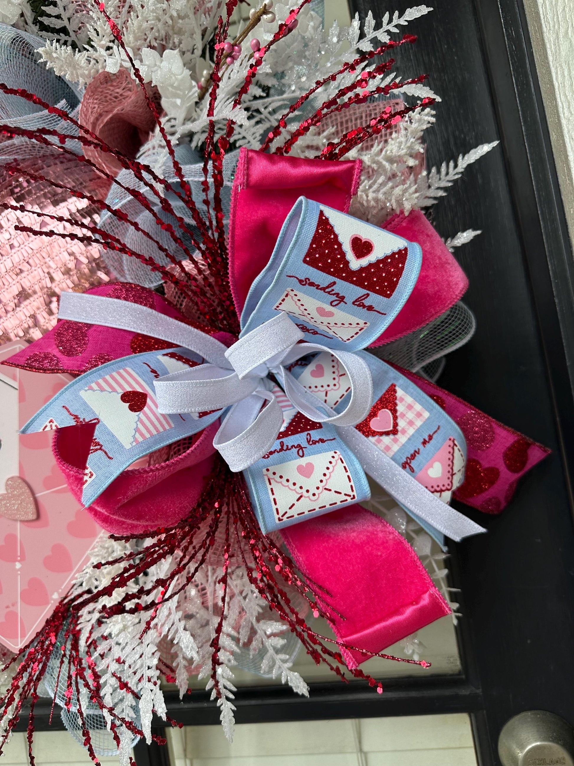 This “P.S. I Love You Wreath” is so cute! Set on a pine wreath base, a big pink sequin heart is the star of the show. Attached to the heart is a sweet little love note that compliments the 2 stunning bows. This wreath is filled with many glittering leaves and stems. The 2 bows are made of several different textures of ribbons. This is a precious piece to show your love to those who come to your door.