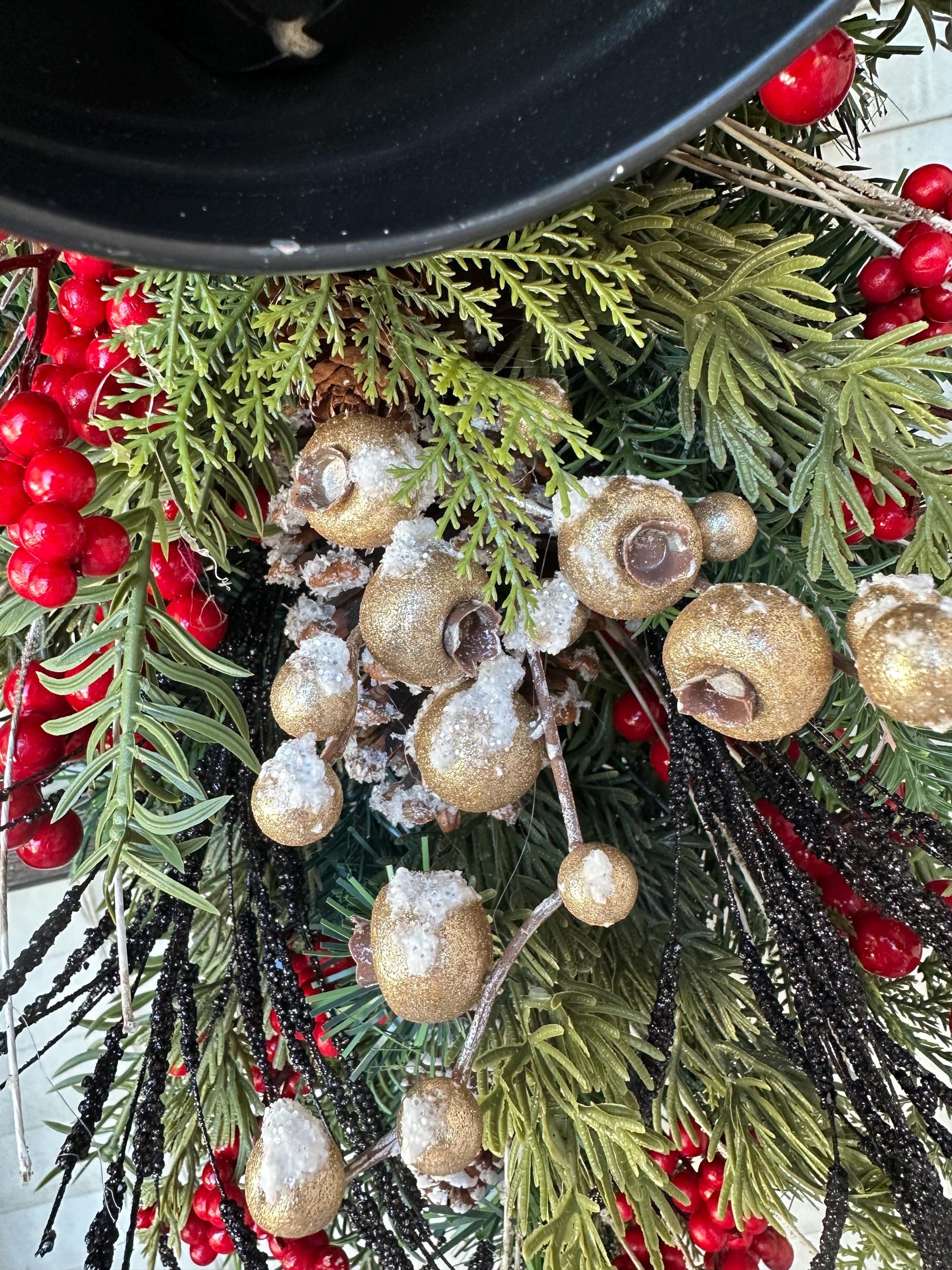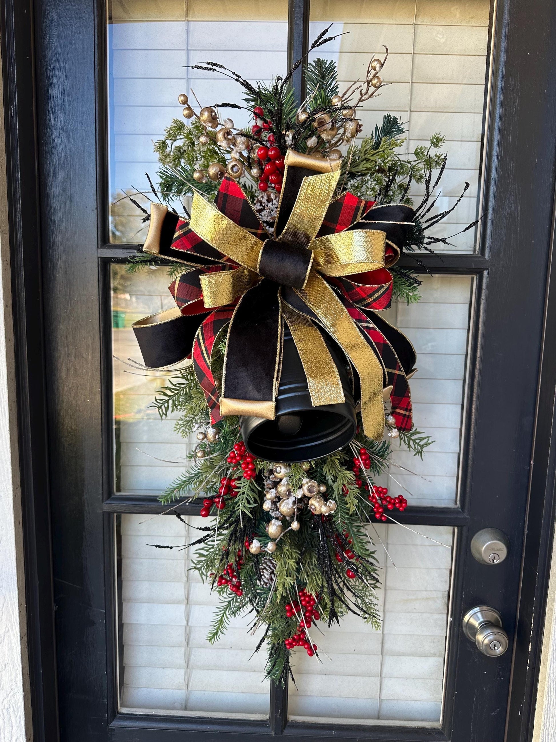 This Red and Black Plaid Bell Door Swag is so rich and beautiful! It begins with a green pine teardrop and a large bow of black velvet, plaid, and gold ribbons. Frosted pinecones, red glittering fern and berries are scattered throughout. Sprigs of white birch stems are added to the piece along with a large black bell. This is a stunning way to decorate for the holidays