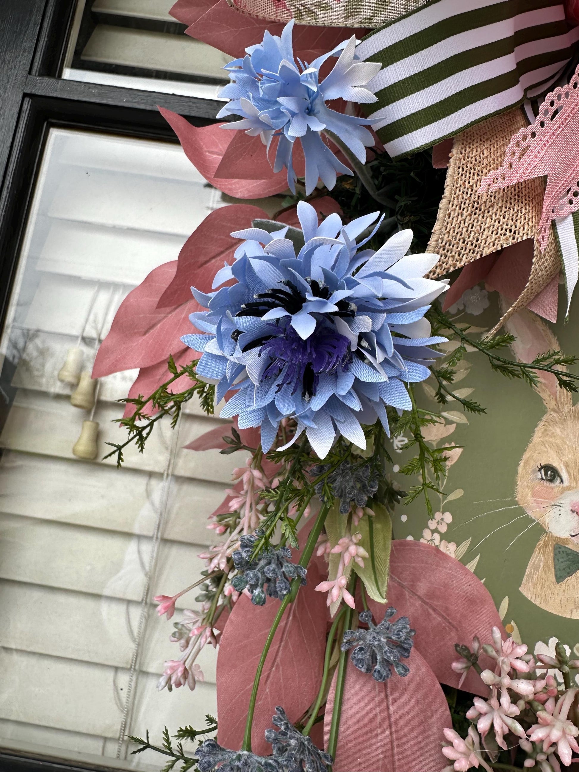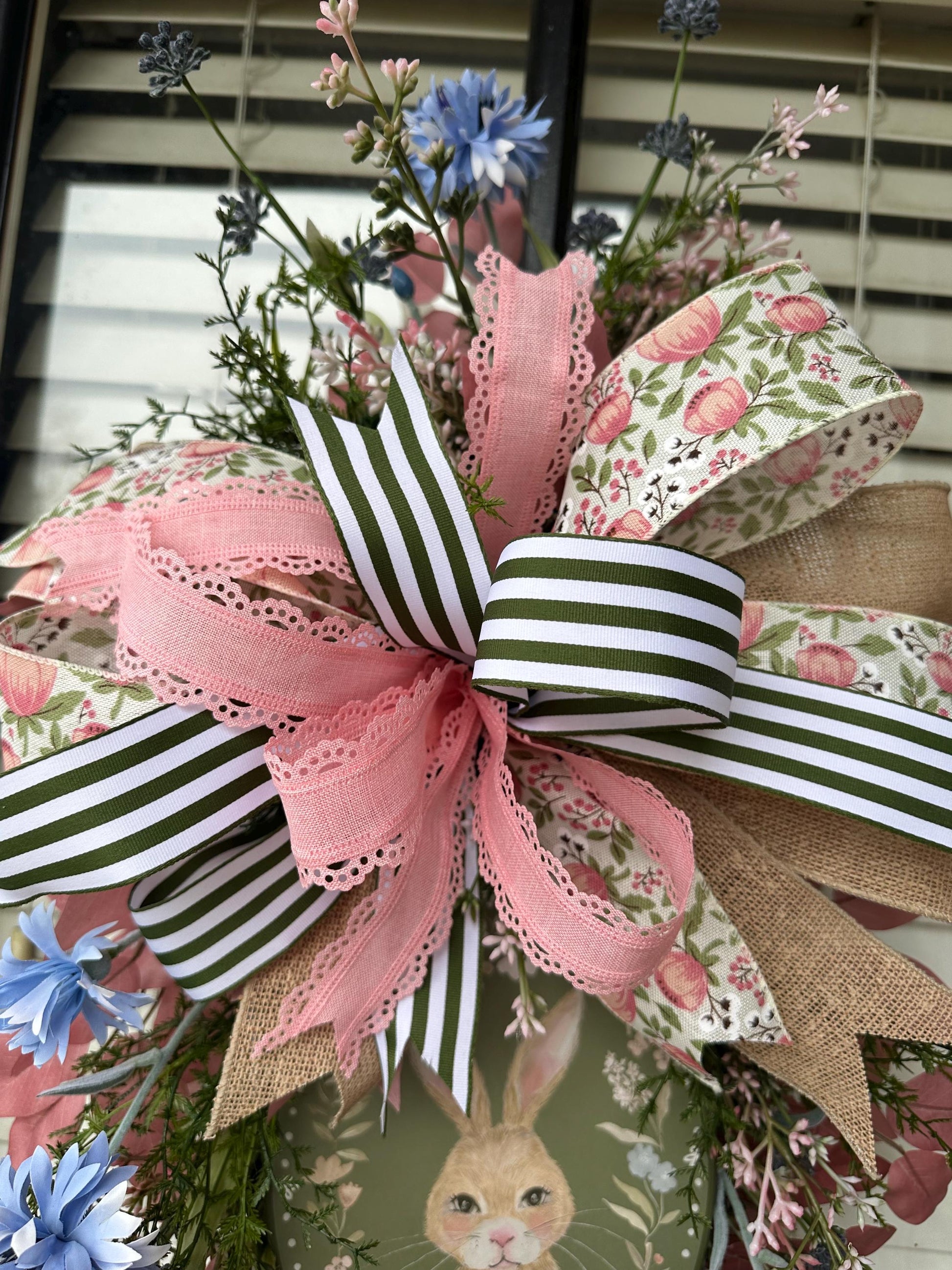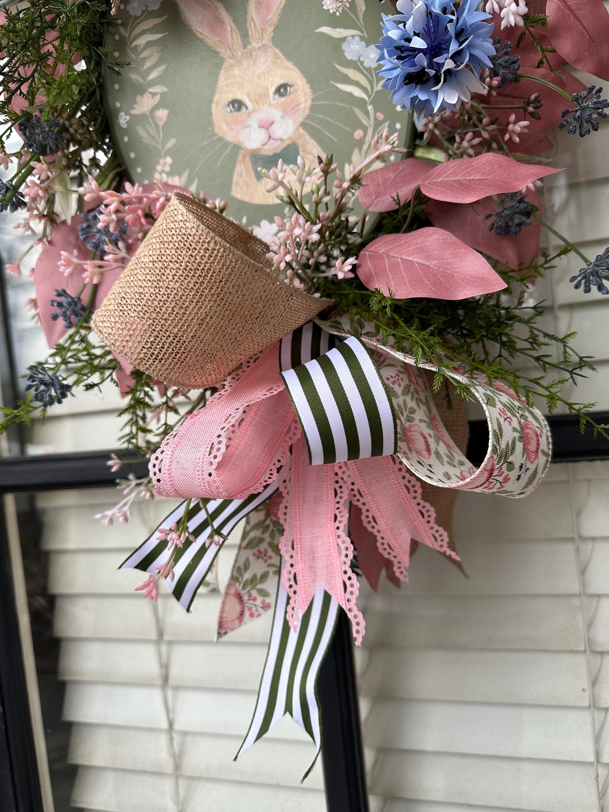 Welcome spring/ Easter or a new baby with this precious Oval Bunny Swag! This darling little rabbit set on a soft green oval is surrounded by a painted floral wreath. The rest of the swag mirrors the florals and colors of the plaque. There are two large bows of beautiful ribbons and burlap at the top and bottom of this swag. Numerous colored leaf pics and pink seeded pics are throughout this sweet piece. Blue cornflowers and seed pods set off the additional florals to make this swag a beautiful addition to your door!